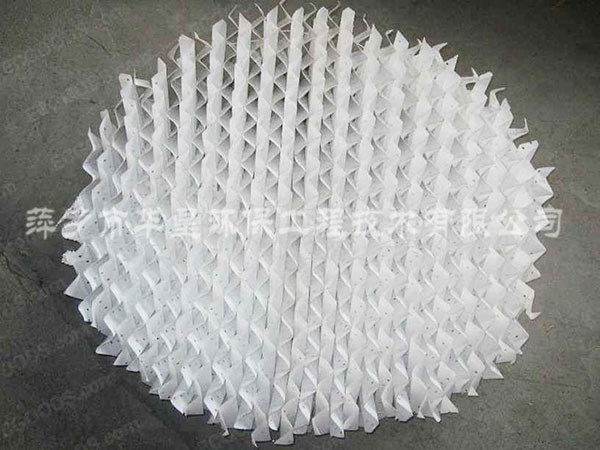 塑料規(guī)整填料具有重量輕,通量大、壓降低、比表面積高、易更換等優(yōu)點。絲網(wǎng)波紋填料由聚丙烯與聚丙烯腈線混合編織網(wǎng)組成。波紋填料可采用聚丙烯PVDF板,為提高傳質效率,板上可開孔。塑料規(guī)整填料有:板波紋填料、孔板波紋填料、絲網(wǎng)波紋填料和斜波紋填料等。